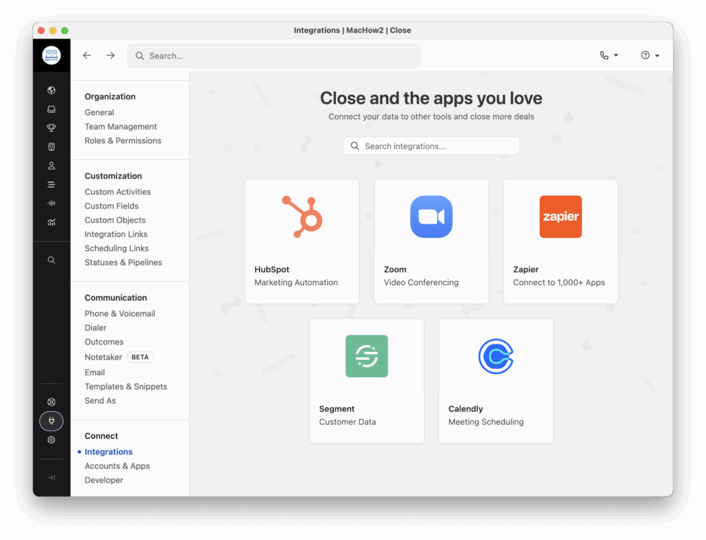 Like any good CRM, Close plays well with other apps. You can sync it with Gmail, plug in Calendly or Zoom, or connect via Zapier to just about any other tool in your stack. The API is well-documented if you want to create a custom connection.