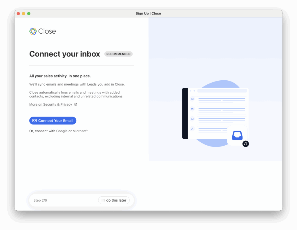 You’ll be asked a few questions about your identity, company role, what you plan to use Close for and how you currently manage your contacts.