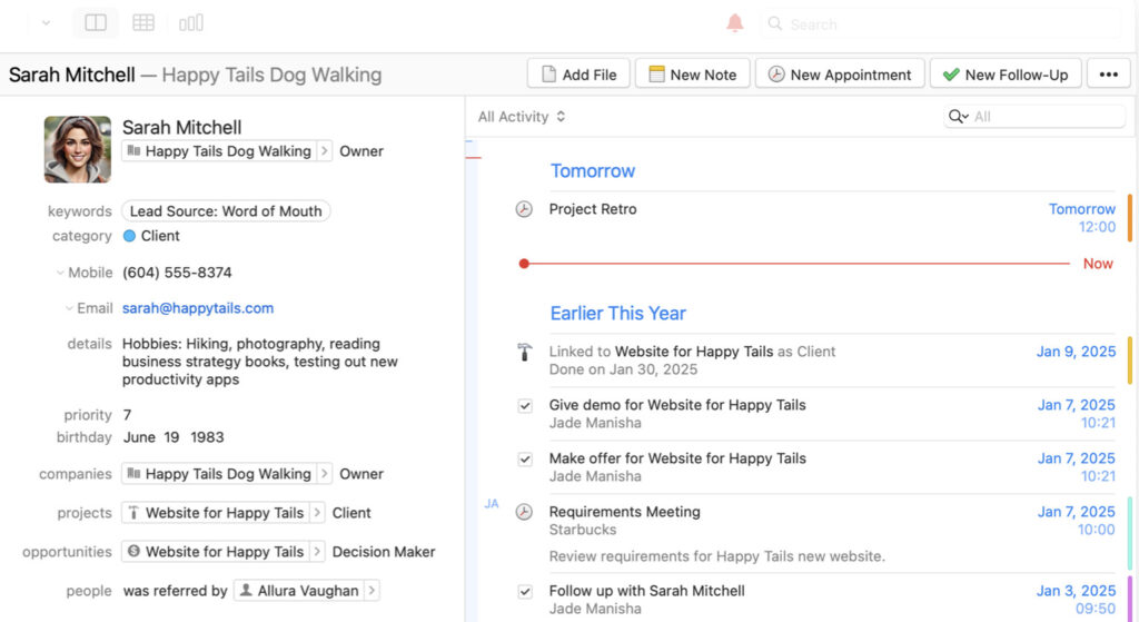 - Contact & Relationship Management: Link contacts to projects, emails, appointments, notes, and deals.