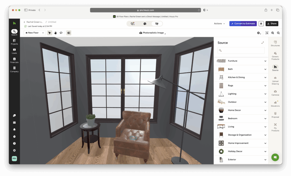The 3D view is where Houzz Pro really shines. You can orbit around, pan, zoom, and switch between different “view modes” (wireframe, shaded, photorealistic).