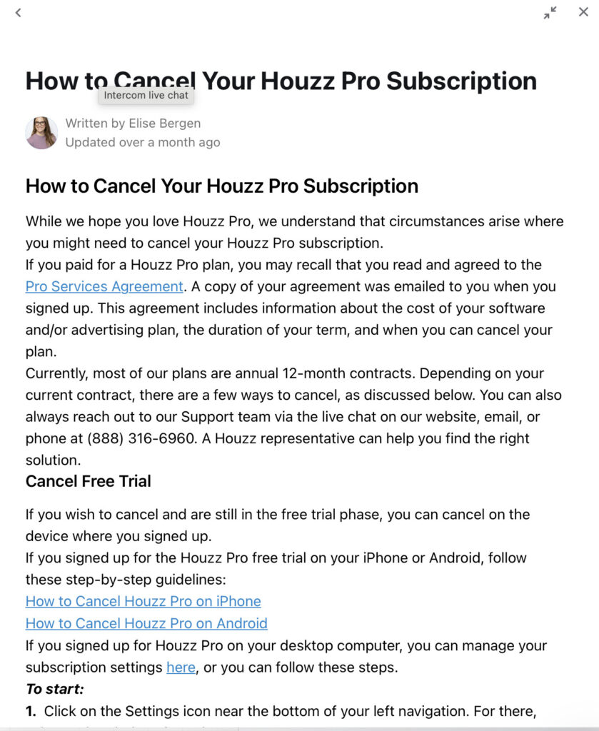 The cancellation policy is clearly accessible from within the Houzz Pro app by clicking on the chat dialog in the bottom right, so it seems the company has taken these complaints seriously.
