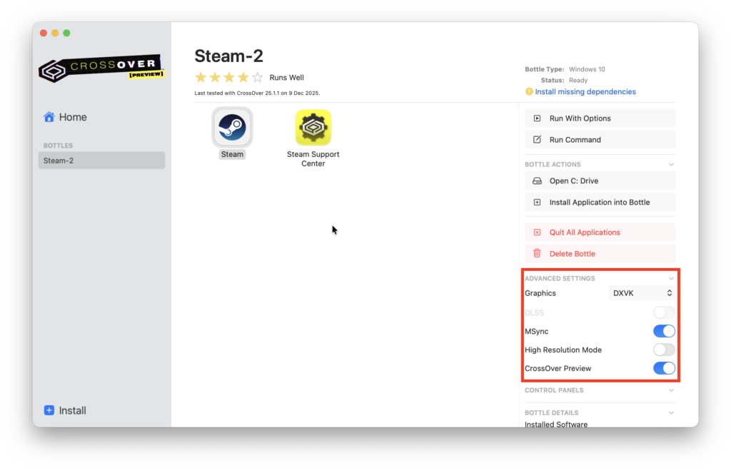 The Preview version acts as like a beta version of upcoming new versions of Crossover and often supports games like Battlefield 6 that the stable version doesn’t.