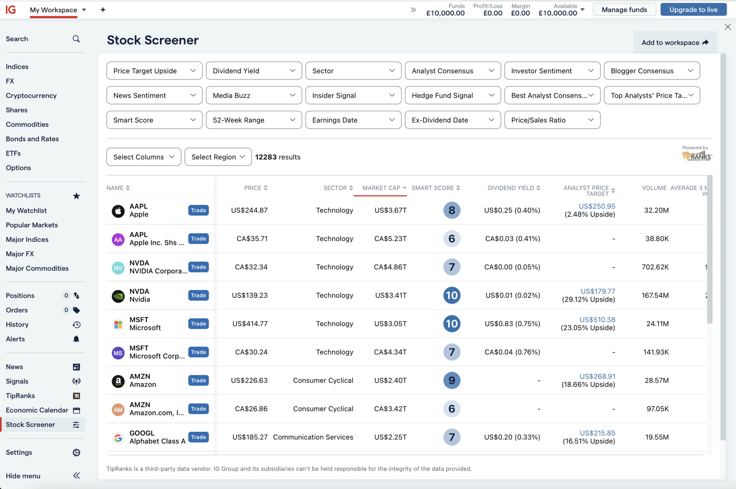 You can also filter by specific criteria such as dividend yield, sector, analyst consensus and even blogger consensus.