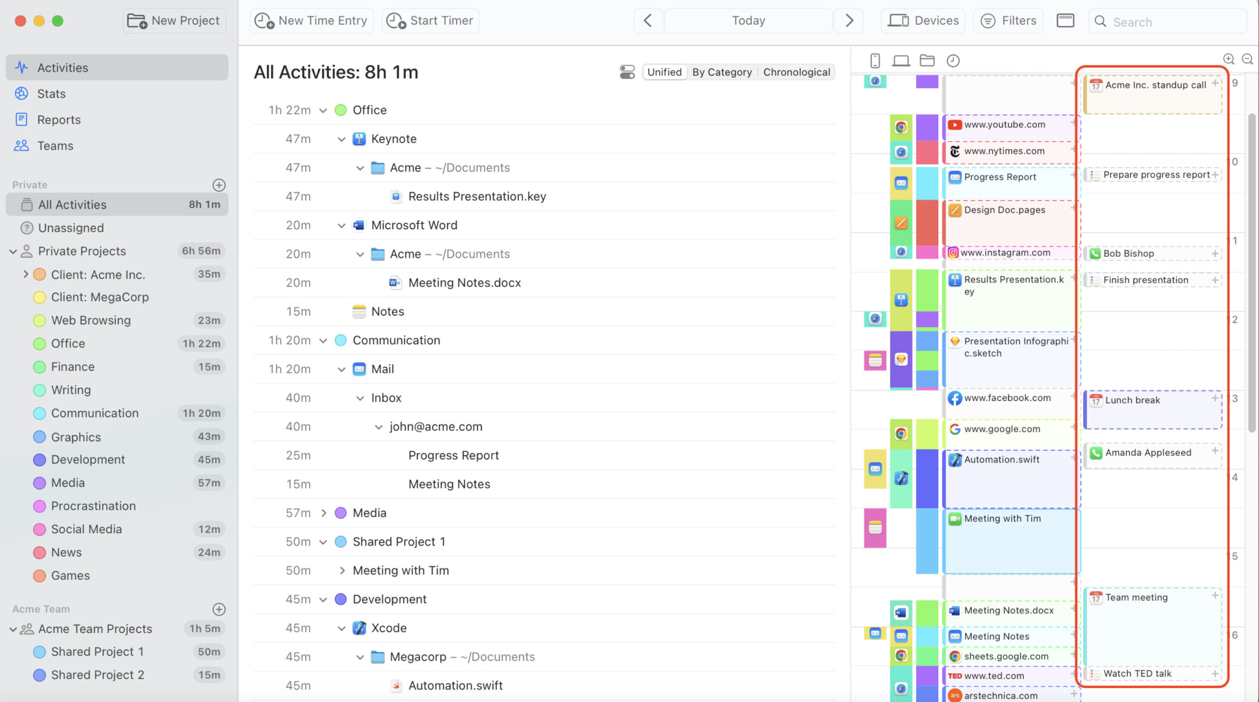 Unlike manual timers like Toggl, Timing automatically tracks everything you do on your Mac.