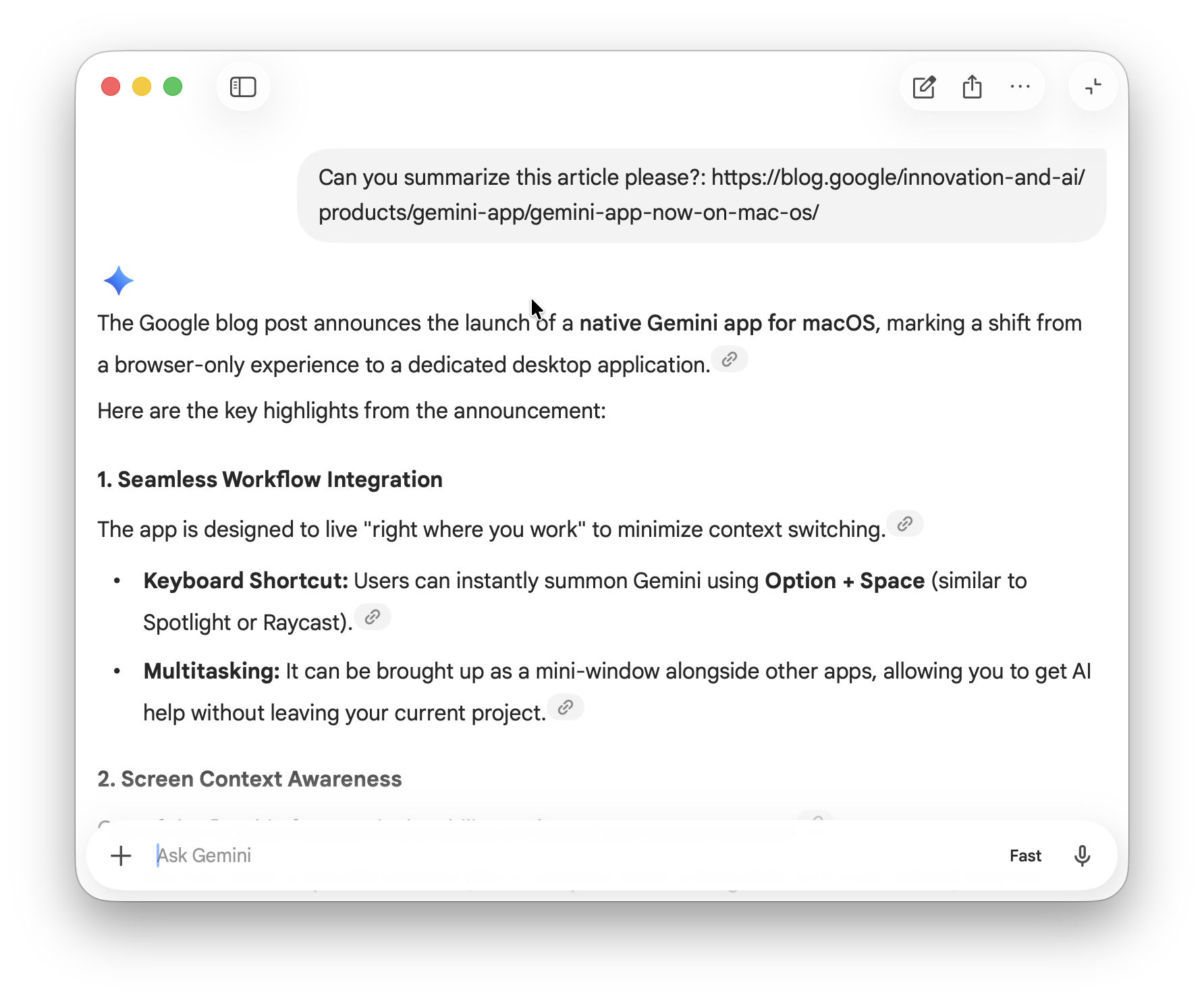 The native Gemini for Mac app turns it from a chatbot into something closer to a real-time assistant embedded in macOS.